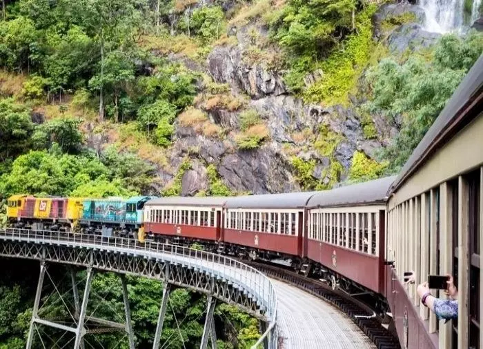 Kiskotie Cairnsista Kurandaan on tänä päivänä kenties maailman kaunein junamatka. 100-vuotias restauroitu juna lähtee Cairnsista ja kipuaa 327 metrin korkeuteen merenpinnasta. Matkan varrella se sukeltaa 15 tunnelin läpi ja ylittää 37 siltaa, ja ikkunoista voit ihastella sademetsiä ja vesiputouksia. Junamatka kestää 3 tuntia, joten nyt voit ottaa rennosti ja vain nauttia matkasta!
