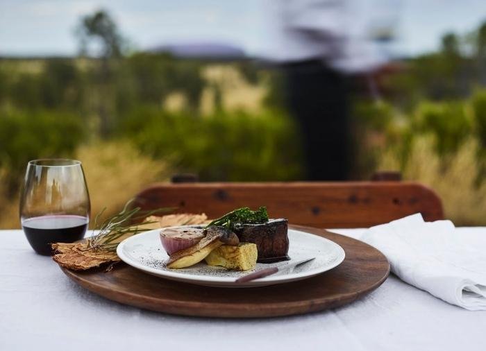 Retkeen sisältyy: meno-paluukuljetus hotellilta, tervetuliaisjuoma ja kanapeet, 4 ruokalajin illallinen viineineen, pääsy Field of Light -installaatioon.