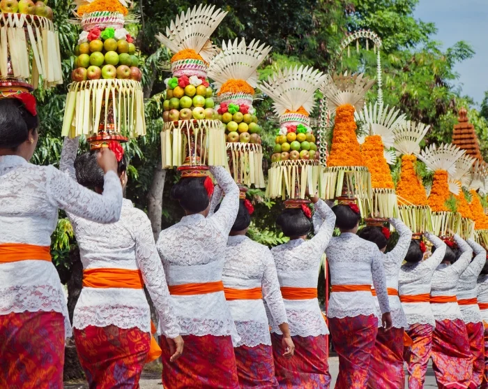 Temppeleissä ja kaduilla järjestetään usein seremoniallisia kulkueita, jotka voivat olla todella hauska ja mukaansatempaava elämys. Jalkakäytävien varsilla näkyy pieniä banaaninlehdistä punottuja koreja, joiden sisältämät uhrilahjat ja suitsukkeet suojaavat pahoilta hengiltä.