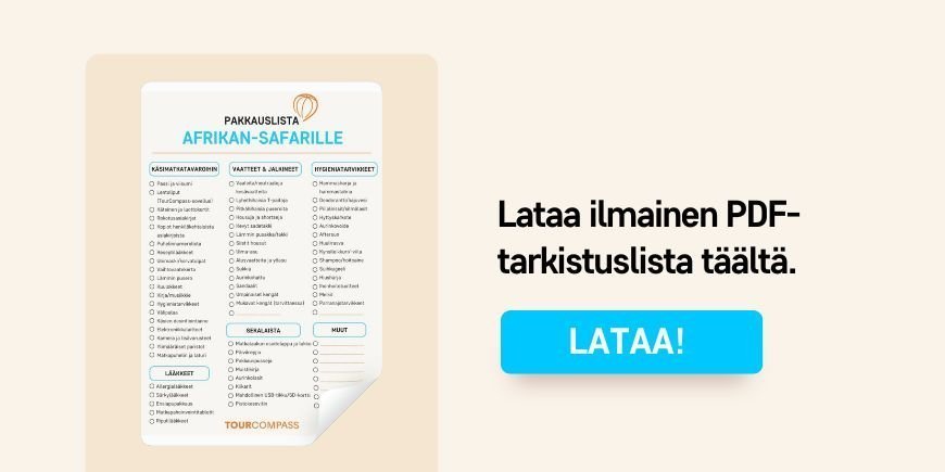 Tästä oppaasta löydät kattavan pakkauslistan tavaroista, jotka kannattaa ottaa mukaan safarimatkalle – vaatteet mukaan lukien.