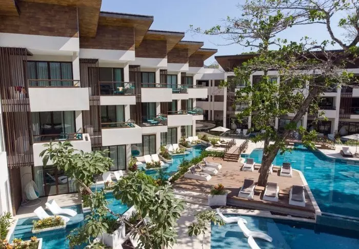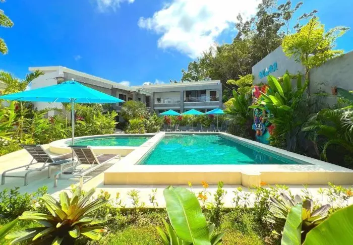 Korkeiden palmujen ja trooppisten kasvien takana piileskelee pieni helmi, The Hideaway -hotelli.