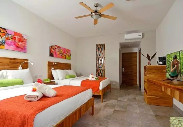 Vaaleansävyiset huoneet on sisustettu moderniin tyyliin, lattiat ovat laatoitettuja ja seinillä on värikkäitä kuvia. Kaikissa huoneissa on ilmastointi, kattotuuletin, taulutelevisio, tallelokero ja oma kylpyhuone hiustenkuivaajalla. Kaikkialla hotellissa on ilmainen WiFi.