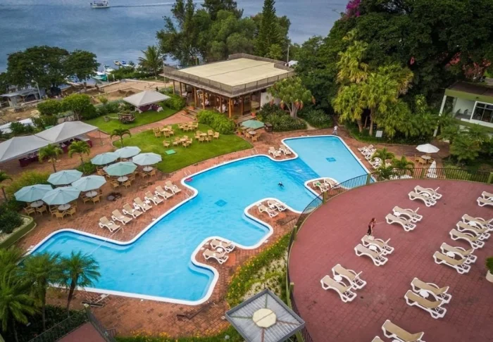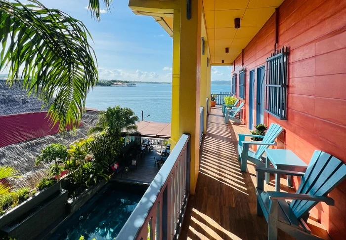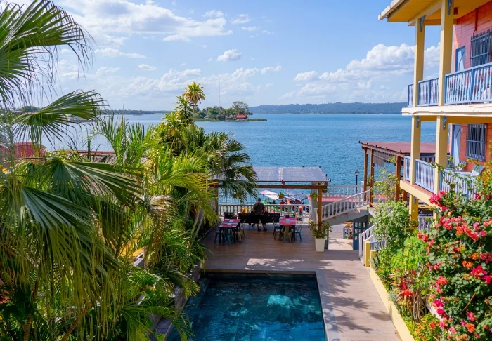 Voit virkistäytyä uima-altaassa tai hypätä poreammeeseen kylmän drinkin kera. Hotellin baarissa on mukava istua ja nauttia upeasta näköalasta Petén Itzá -järvelle.