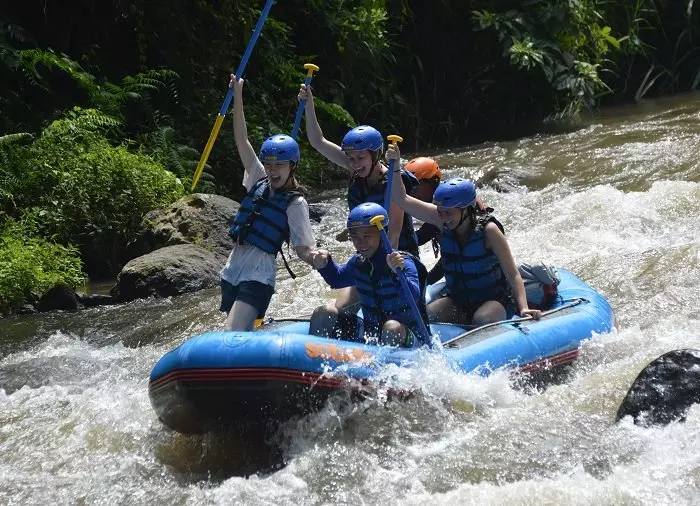 Kaipaatko kutinaa vatsanpohjaan? Lähde superhauskalle ja takuulla ikimuistoiselle koskenlaskuretkelle Ayung-joelle, joka virtaa läpi Ubudin rehevän viidakon.