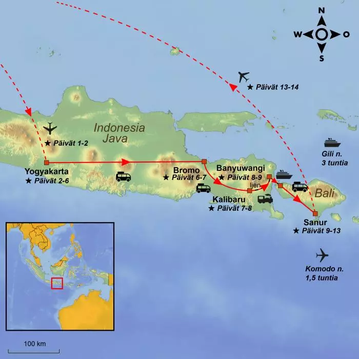 Jaava sijaitsee Tyynenmeren ”tulirenkaalla”, josta löytyvät maailman aktiivisimmat tulivuoret, ja kaikkialla Jaavalla sinua odottavat toinen toistaan upeammat maisemat: kauniiden, lähes ikivihreiden riisipeltojen taustalla kohoavat kartionmuotoiset tulivuoret. Pääset vierailemaan kylissä ja kaupungeissa, joista monet ovat satoja vuosia vanhoja. Joissain kadut on päällystetty mukulakivillä, toisia taas suojaavat 20-metriset, reidenpaksuiset bambukasvustot. Kaiken keskipiste on vaikuttava Borobudur, yksi maailman suurimmista ja kauneimmista buddhalaisista pyhäköistä. Aivan Borobudurin lähellä sijaitsee kiehtova Prambananin hindulainen temppelikompleksi. Matkan aikana käydään myös aktiivisella Bromo-tulivuorella, jonka luokse päästäkseen on kahlattava legendaarisen ”hiekka-aavikon” yli. Jaavan kiertomatkalla pääset näkemään myös mauste-, kahvi- ja teeplantaaseja, kokemaan kontrastin perinteisen ja modernin elämäntavan välillä ja tutustumaan hymyileviin ja vieraanvaraisiin paikallisasukkaisiin. Matkan huipentaa muutaman päivän rentouttava rantaloma yhdellä Balin kauneimmista rannoista Sanurissa.