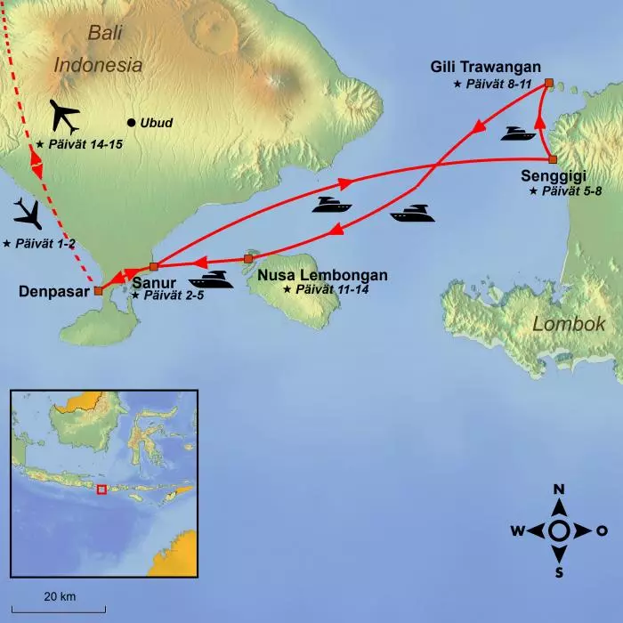 Koe 4 hyvin erilaista saarta: Bali, Gili, Lombok ja Nusa Lembongan. Nauti laiskoista päivistä rannalla, upeista snorklausmahdollisuuksista ja unohtumattomista auringonlaskuista.