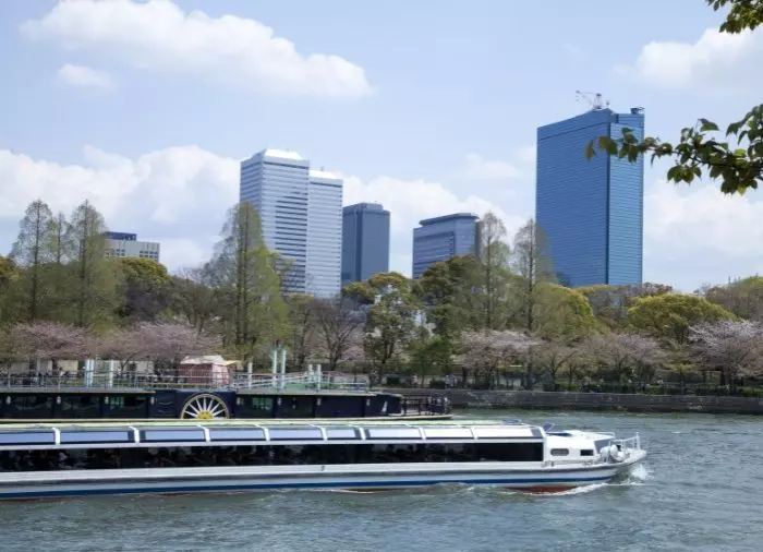 Osakan linnasta kävellään lyhyt matka jokirantaan, jossa noustaan Aqualiner-laivaan ja lähdetään sightseeing-kierrokselle Osakan vesiteitä pitkin.
