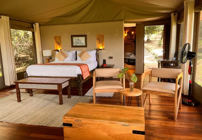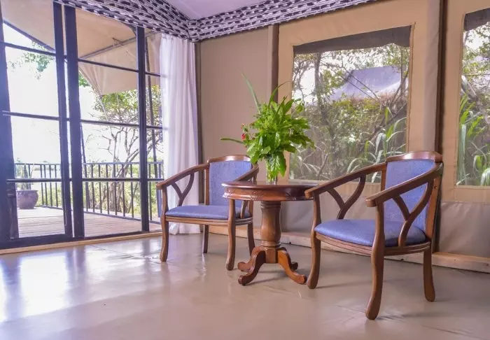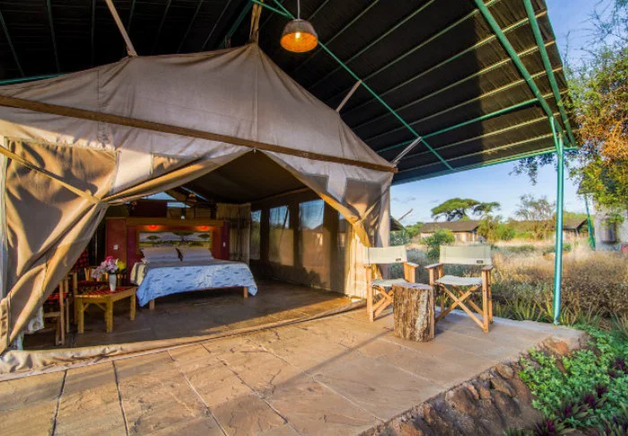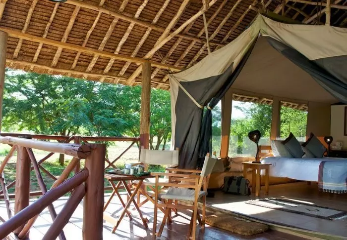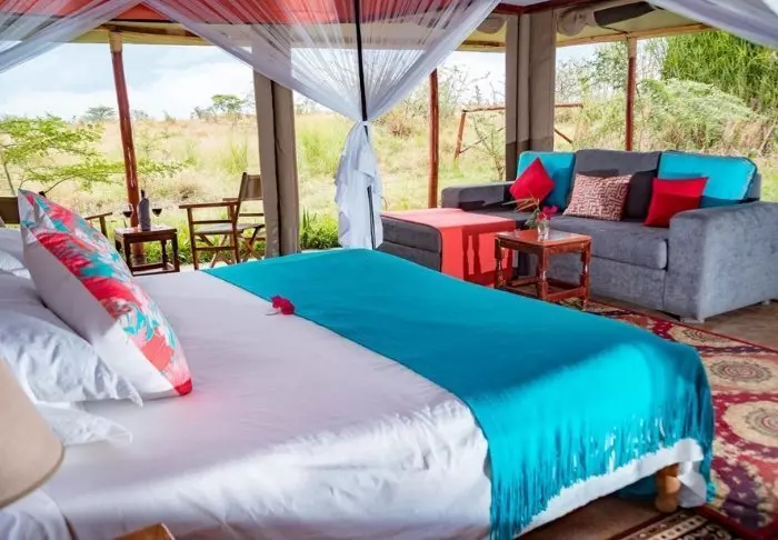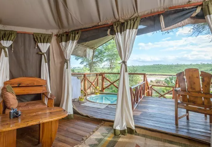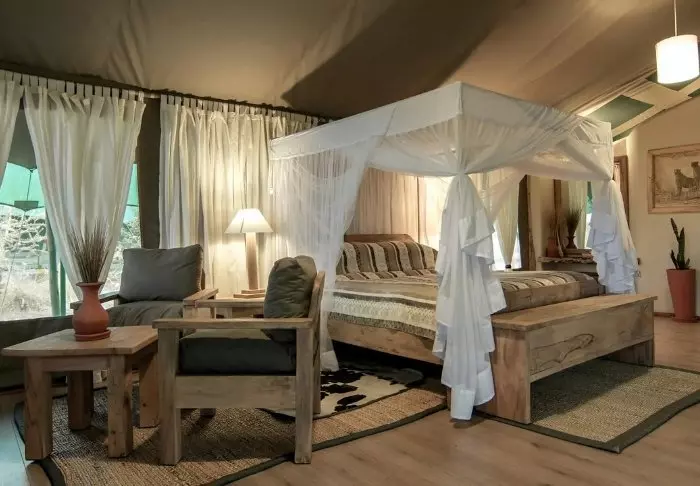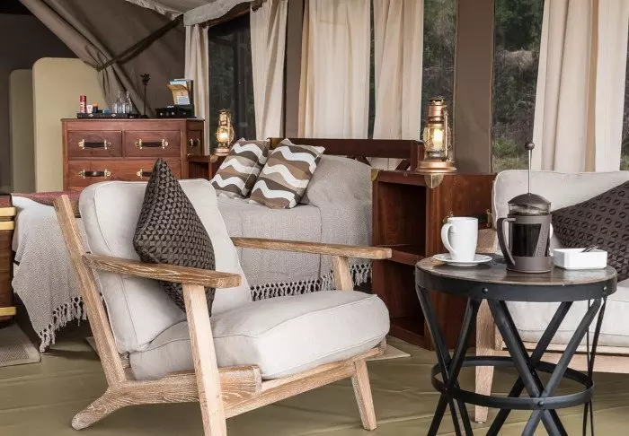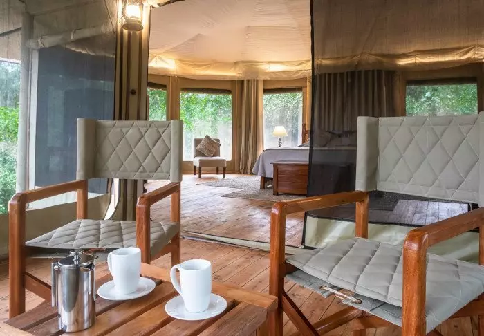 Jokaisessa teltassa on tuuletin, juomavesiannostelija ja sängyissä hyttysverkot. Matkatavaroille on hyvin tilaa, ja teltassa on myös viihtyisä lukukulmaus. Verannalla on mukavat istumapaikat, jotka sopivat erinomaisesti viinin nauttimiseen ja auringonlaskun ihailemiseen Afrikan savannin yllä.