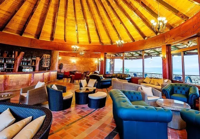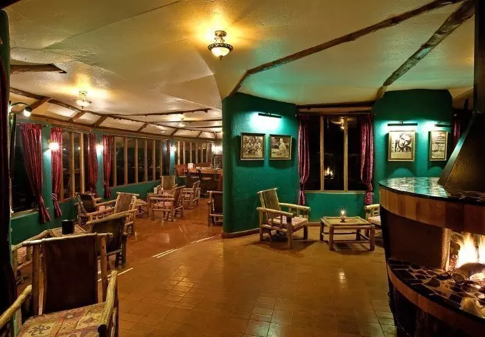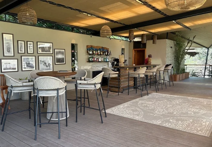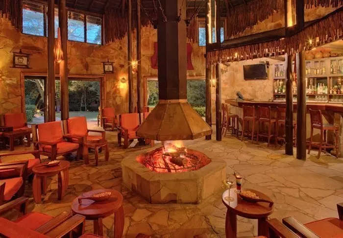 Lodgessa on keskeisellä paikalla sijaitseva olkikattoinen ruokailutila sekä luonnonkivestä rakennettu baari. Ruokailutilasta ja baarista pääsee terassille, josta on suora näkymä alas juomapaikalle.