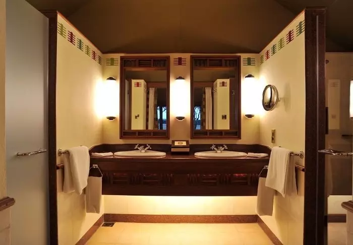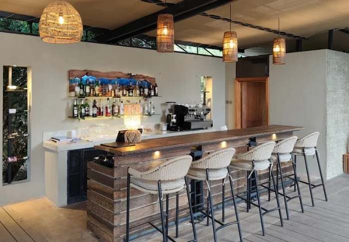 Baari ja ravintola ovat viihtyisiä ja kutsuvia. Asiakkaiden käytössä on pehmeitä sohvia ja viihtyisiä oleskelunurkkauksia, ja kuten teltoissakin, niiden sisustuksessa on käytetty luonnonmateriaaleja, kuten puuta ja kiveä. Värit ovat hillittyjä, jotta pääpaino olisi luonnossa.