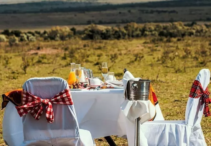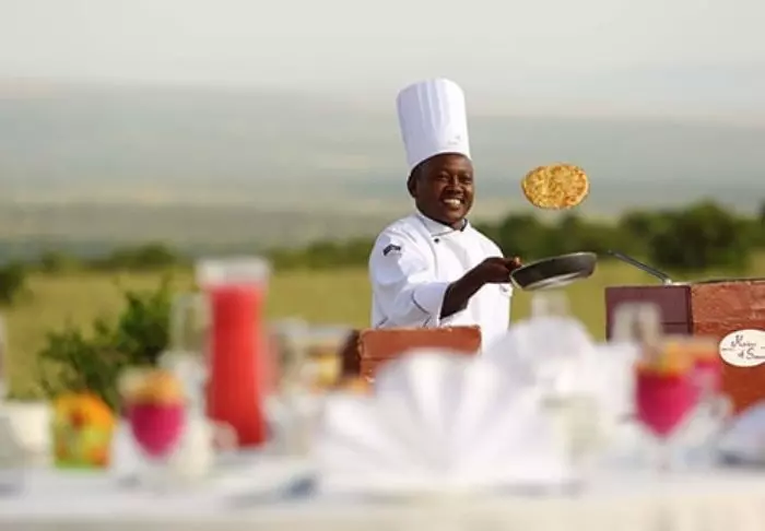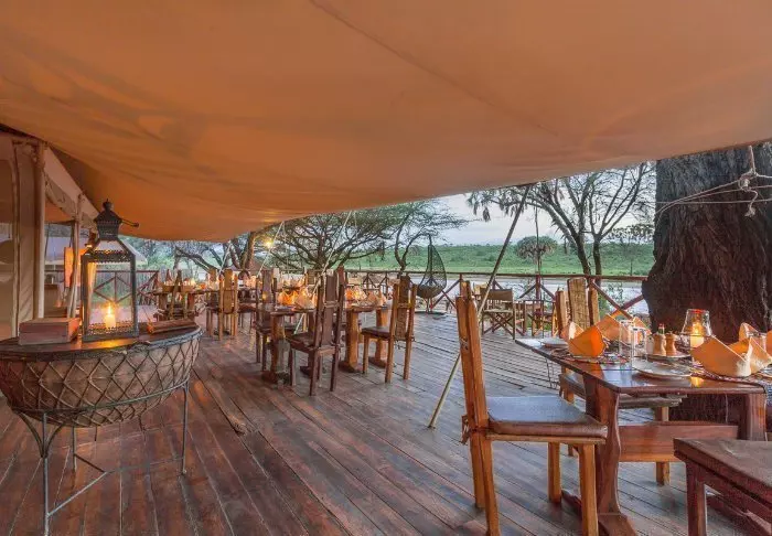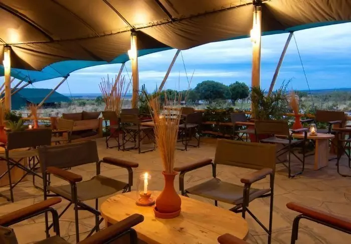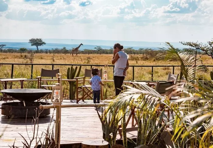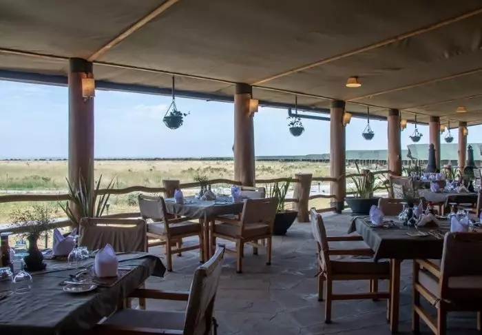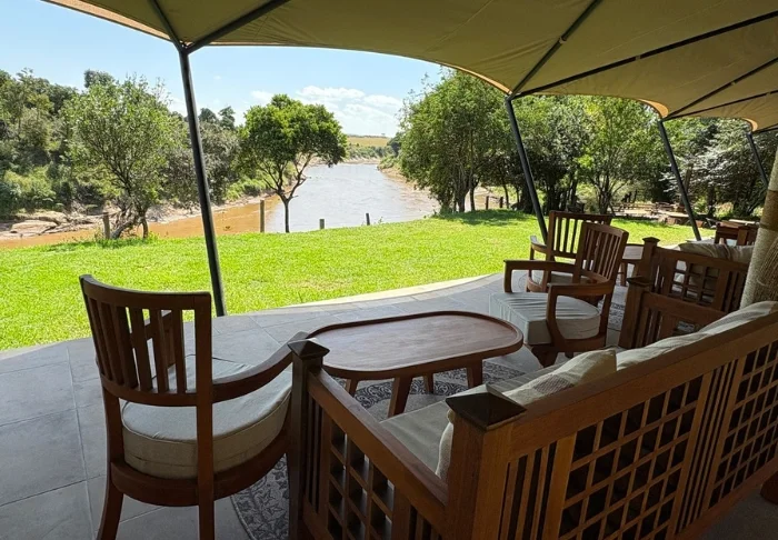 Istuessasi mukavassa tuolissasi kupillinen kahvia kädessäsi saatat ehkä miettiä, miksi ihmeessä edes lähtisit tänään safariajelulle. Kaikki on nimittäin jo täällä. Edessäsi avautuvat upeat näköalat joen yli Masai Maran tasangoille, ja tasaisin väliajoin yksi tarjoilijoista käy kysymässä, tarvitsetko kenties jotain.