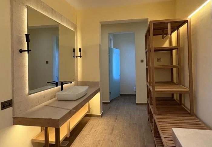 Teltat on sisustettu vaaleilla väreillä ja luonnonmateriaaleilla, jotka sointuvat kauniisti ympäristöön. Seiniä ja lattioita koristavat kauniit, tunnelmaa luovat yksityiskohdat.