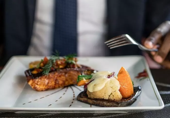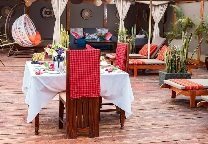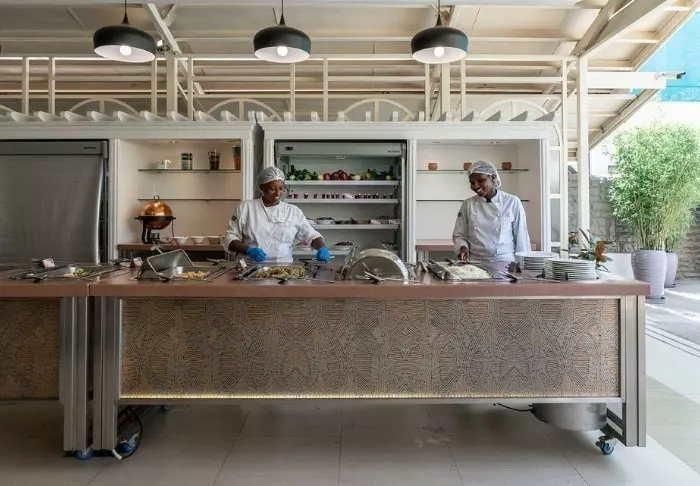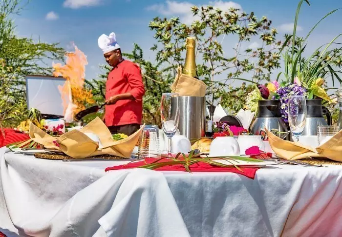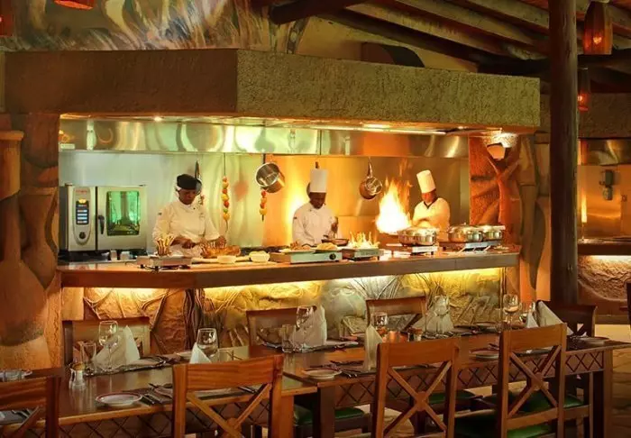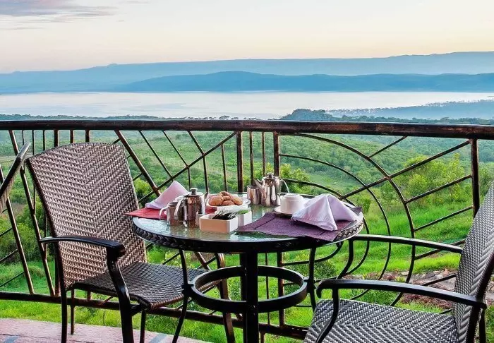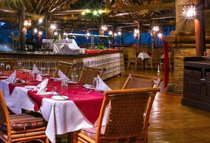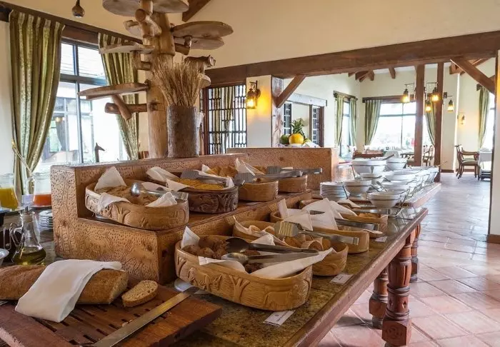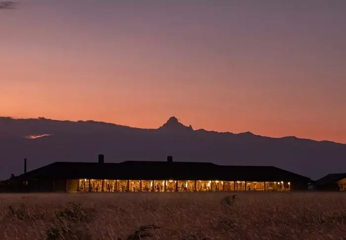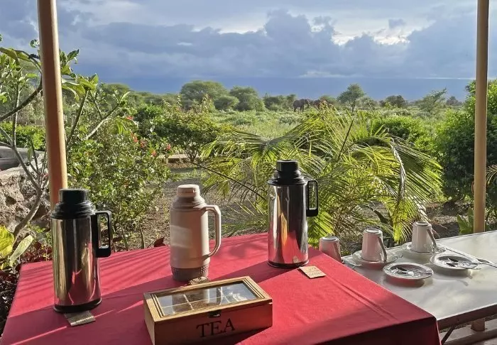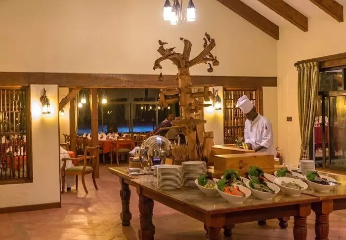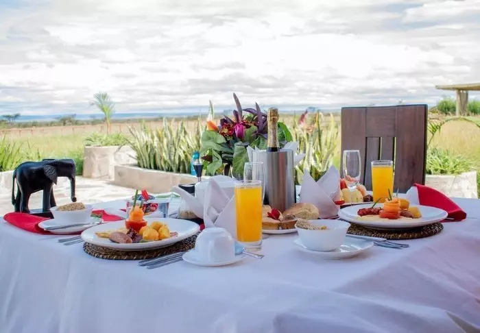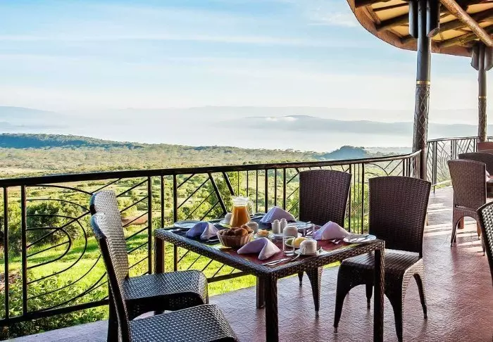 Ateriat tarjoillaan osittain avonaisessa ravintolassa, josta on näköala Kilimanjarolle.