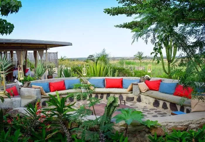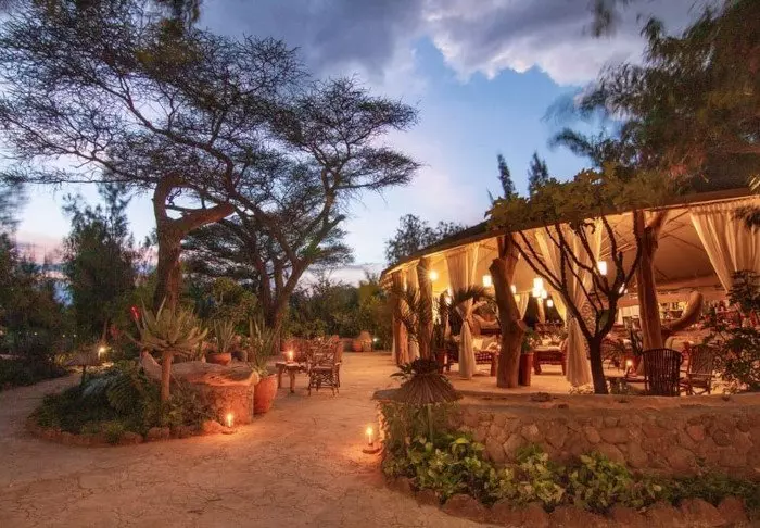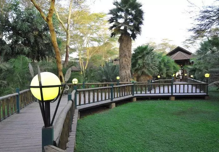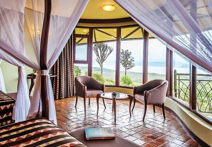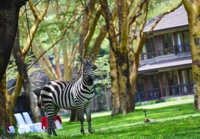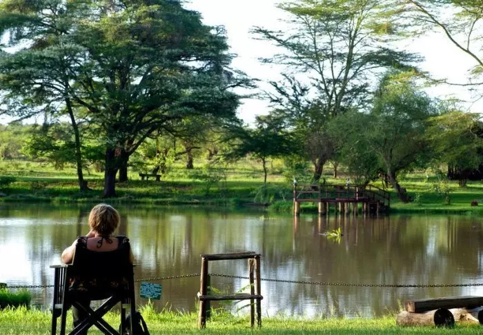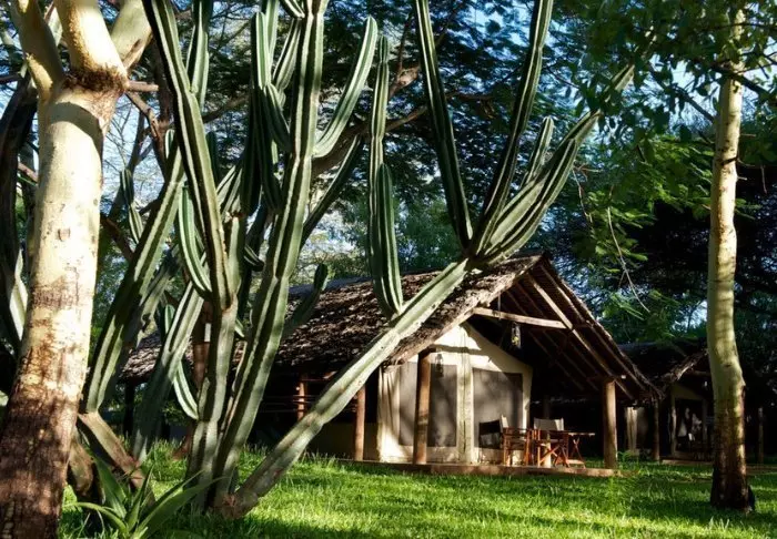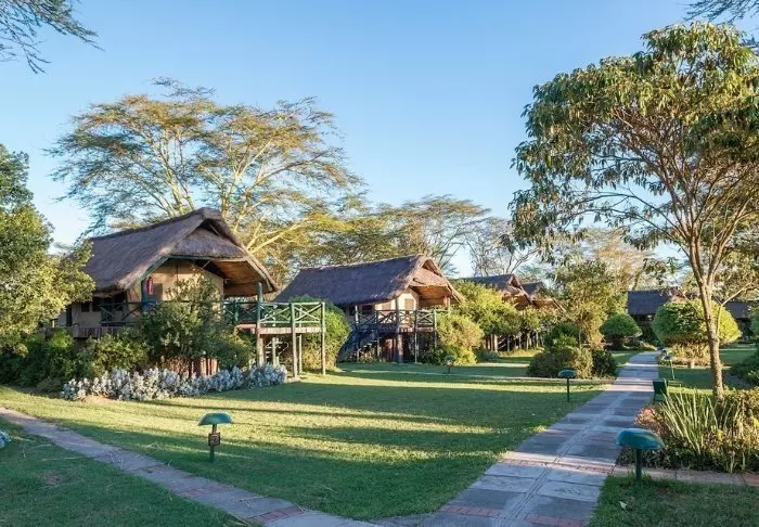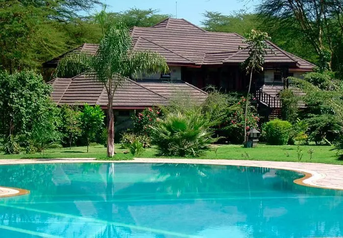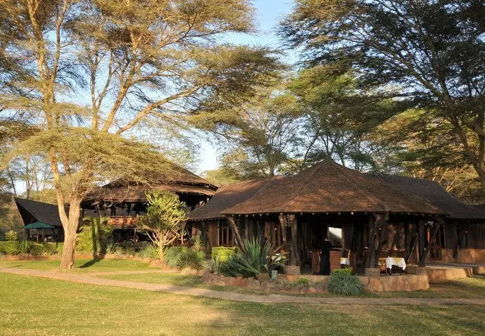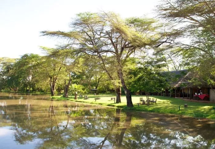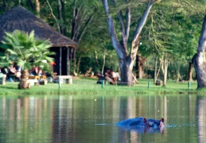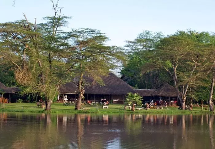 Tämä viihtyisä turistiluokan lodge sijaitsee aivan Naivasha-järven rannalla.