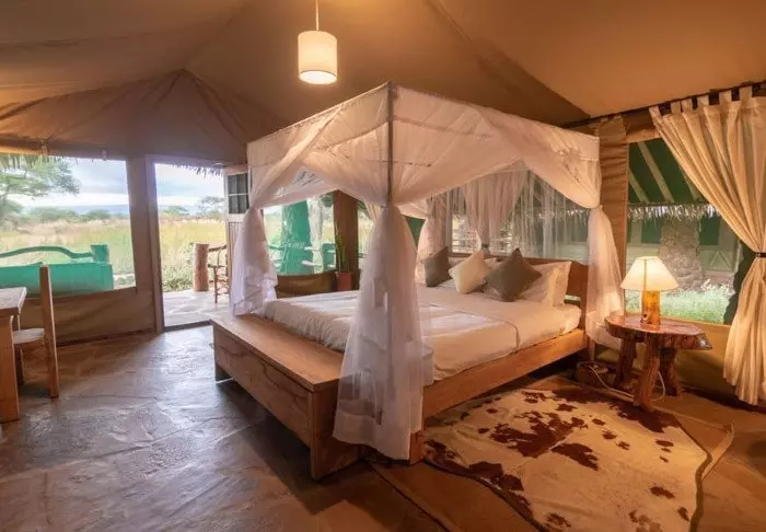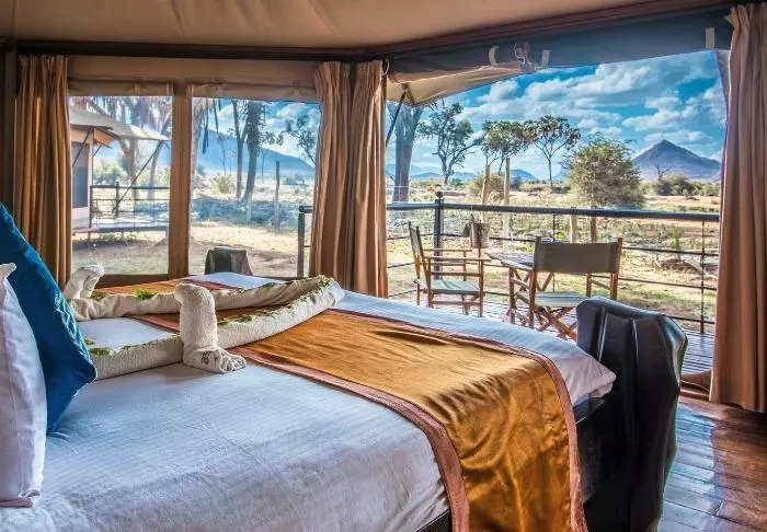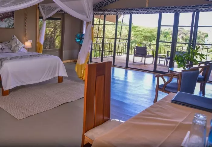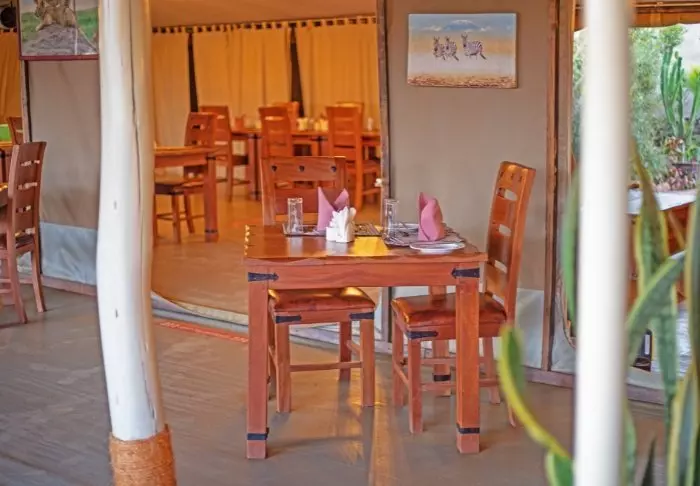 Telttoja on 25, ja ne sijaitsevat rinnakkain leirin ravintola luonnollisena keskipisteenään. Se tarkoittaa, että kaikista teltoista avautuu upea näköala virtahepoaltaalle ja naapurimaa Tansaniassa kohoavalle majesteettiselle vuorelle.