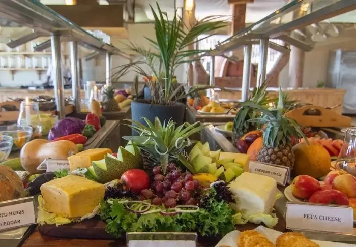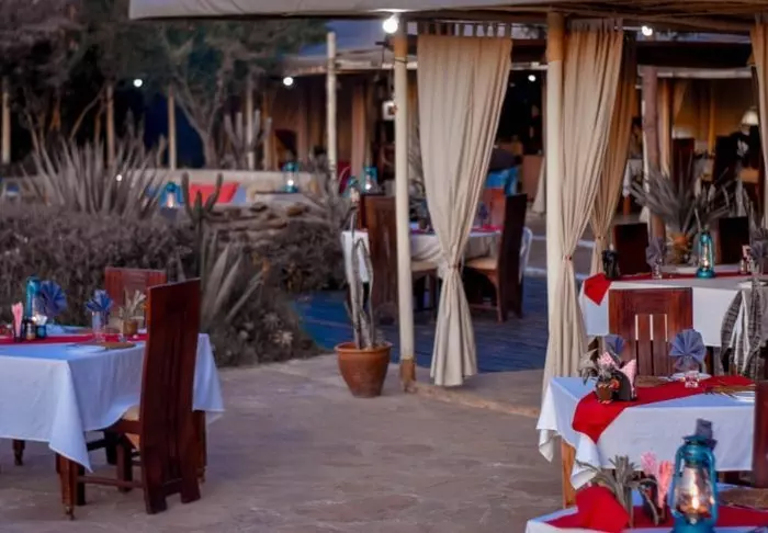Ateriat tarjoillaan päärakennuksessa, jossa sijaitsevat myös vastaanotto ja viihtyisä baari. Valittuina iltoina baarissa on joskus live- musiikkia. Ravintolan edessä on suuri nurmikkoalue, jossa on penkkejä ja mukavia nurkkauksia, joista voi ihailla näkymää vesialtaalle. Ravintolan ja telttojen välissä on uima-allas, jota ympäröivät aurinkotuolit.