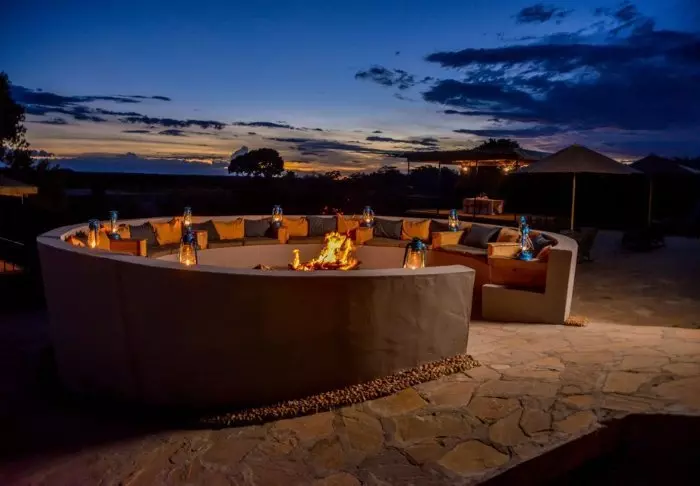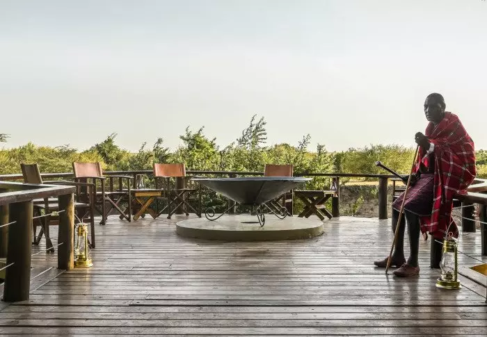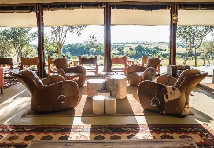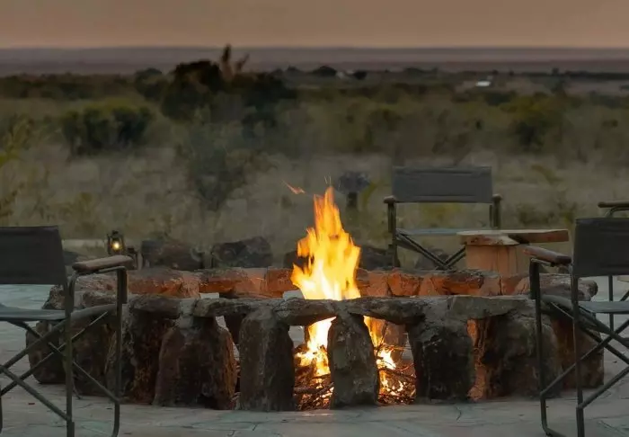 Tunnet olosi tervetulleeksi heti ensi hetkestä alkaen, ja on vaikea olla vaikuttumatta joen toisella puolella siintävistä tasankonäkymistä. Leirin sisäänkäynti on suunniteltu niin, että katse hakeutuu kohti muurattua nuotiopaikkaa, istumapaikkojen värikkäitä tyynyjä ja taustalla avautuvaa upeaa Masai Maraa.