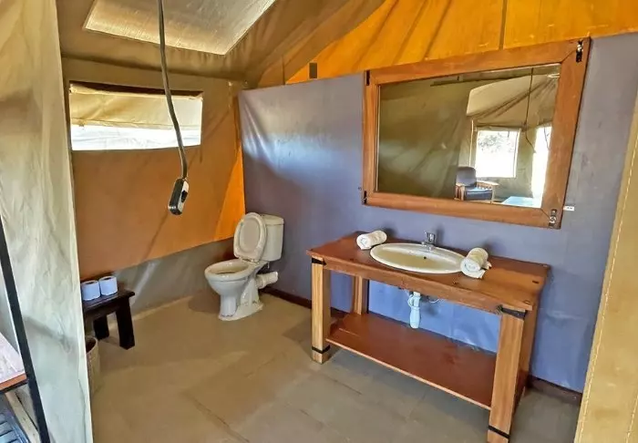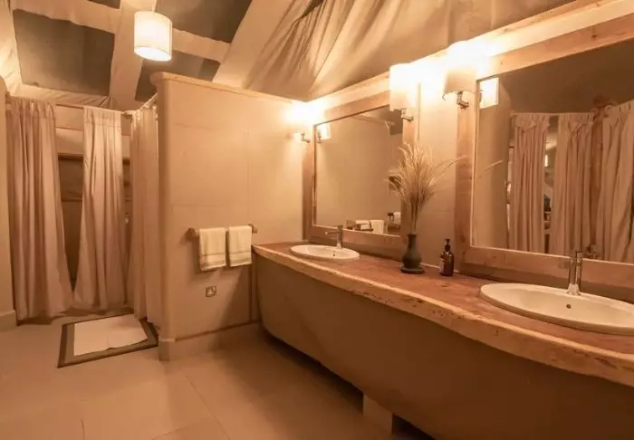 Tilavissa teltoissa on oma kylpyhuone, tavallinen sisä-WC sekä suihku, josta tulee kylmää ja lämmintä vettä. Lattiat ovat kiinteitä parkettilattioita, mutta seinät ovat kangasta, joten voit edelleen kuulla ja haistaa ympäröivän luonnon. Saat siis kokea aidon ”bush-elämyksen” – mutta mukavuudesta tinkimättä.
