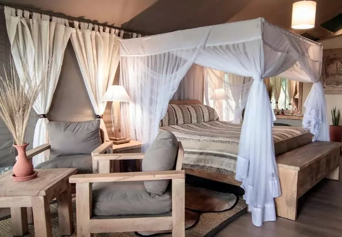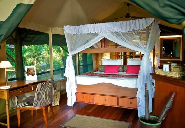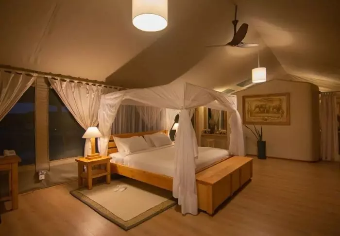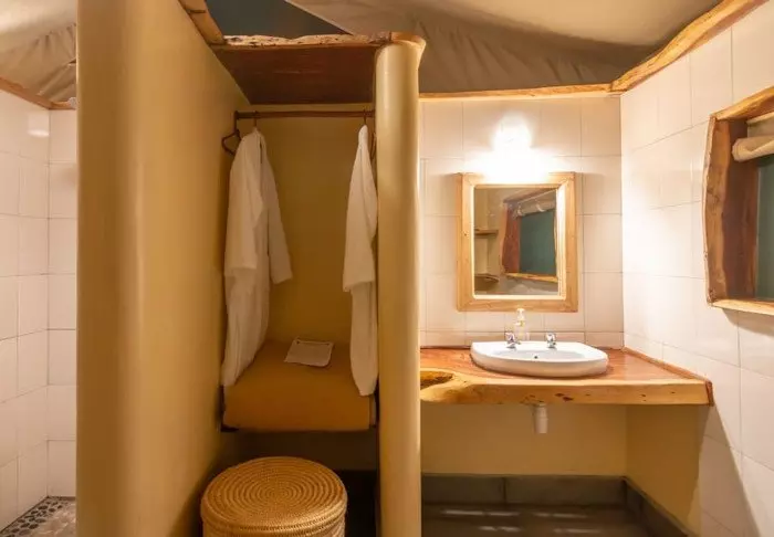 Leiri koostuu 28 hyvin varustellusta teltasta, joissa on hyttysverkot, kylpyhuoneet ja oma terassi – osasta on näköala savannille ja osasta joelle. Kaikissa teltoissa on kangasseinät ja -katto, joten voit sekä haistaa että kuulla luonnon teltan ulkopuolella.