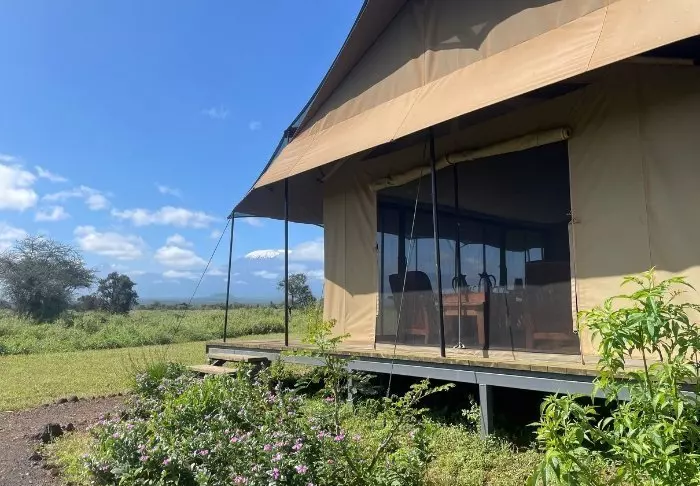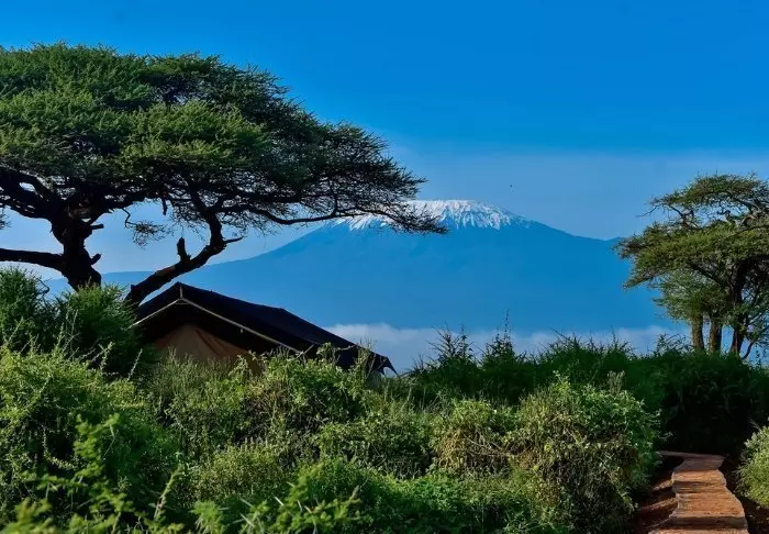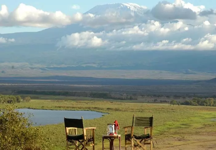 Viihtyisä leiri sijaitsee aivan Amboselin kansallispuiston ulkopuolella ja tarjoaa upean näköalan Kilimanjarolle.