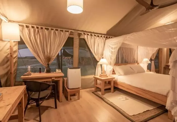 Leirin 12 telttaa on sisustettu kaikkien taiteen sääntöjen mukaan pehmeillä sängyillä, puulattioilla ja värikkäillä matoilla. Tilaa riittää sekä sängyille että pöydälle ja nojatuoleille. Kaikissa teltoissa on luonnollisesti oma kylpyhuone, jossa on juokseva vesi (kylmä ja kuuma). Kaikissa teltoissa on oma terassi, johon kuuluu pikkuinen plunge pool -allas, jossa on mukava vilvoitella kuumimpina päivinä.