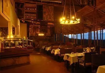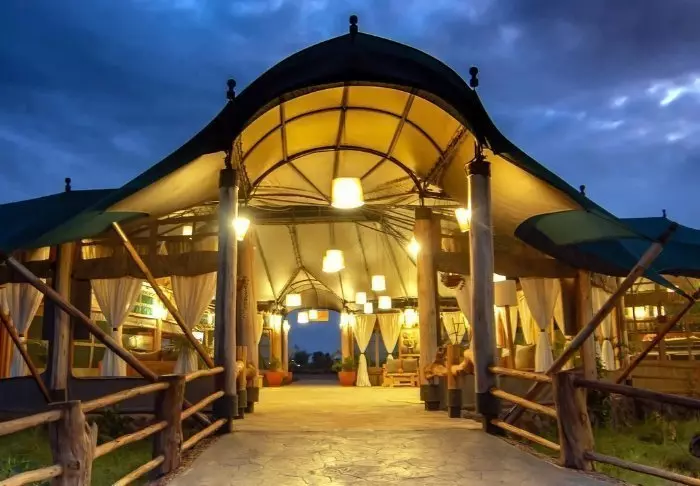 Messiteltassa on tarjolla hyvää ruokaa ja kiehtovia safaritarinoita. Myös messiteltan seinät ovat kangasta, ja kauniit kalusteet ja taidokkaasti valmistetut valaisimet luovat juuri sopivan ylellistä tunnelmaa.