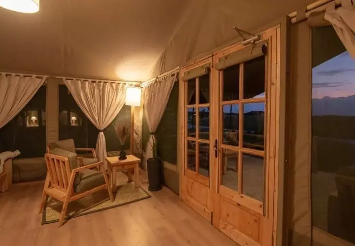 Mukavuudesta ei kuitenkaan tarvitse tinkiä! Kangasteltassa on runsaasti tilaa pöydälle, tuoleille ja pehmeälle sängylle, ja tila on sisustettu kauniisti luonnonväreillä, joten mikään ei ”pistä silmään”. Kaikissa teltoissa on luonnollisesti oma ”kylpyhuone” teltan takaosassa, ja suihkusta tulee lämmintä vettä. Telttoja on yhteensä 12, ja jokaiseen kuuluu oma viihtyisä terassi. josta aukeaa hieno näköala tasangoille.