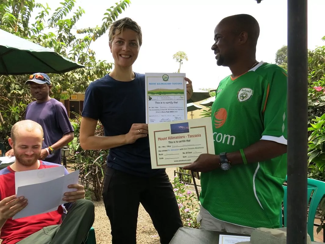 Aamiaisen jälkeen matka jatkuu Mweka-portille. Uloskirjautumisen jälkeen sinut noudetaan portilta ja kuljetetaan takaisin hotellille Moshiin. Hotellissa sinua odottaa herkullinen lounas. Kaikki vuorelle nousseet saavat diplomin muistoksi urakastaan.