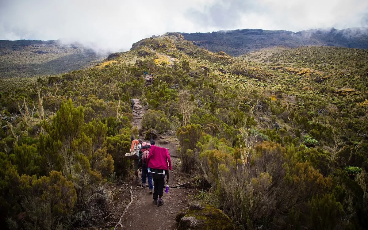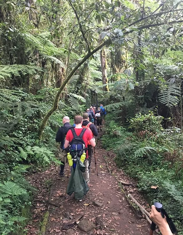 Kilimanjaro koostuu kolmesta sammuneesta tulivuoresta, jotka ovat Kibo, jonka korkein huippu on Uhuru (5895 metriä merenpinnan yläpuolella), Mawenzi (5149 m mpy) ja Shira (3962 m mpy). Reitti kulkee metsän ja sademetsän läpi, jossa voit hyvällä onnella nähdä myös vilauksen mustavalkoisesta gueretsa-apinasta tai muista metsän lukuisista eläimistä. Kantajat kulkevat edeltä, jolloin teltat ja varusteet ovat jo paikallaan siinä vaiheessa, kun saavut Mti Mkubwa Camp -leirille.