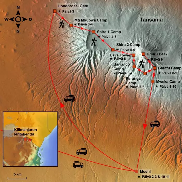 Korkeudet: Moshi: 915 m mpy, Londorossi Gate: 2250 m mpy, Lemosho Glades: 2000 m mpy, Mti Mkubwa Camp: 2 750 m mpy