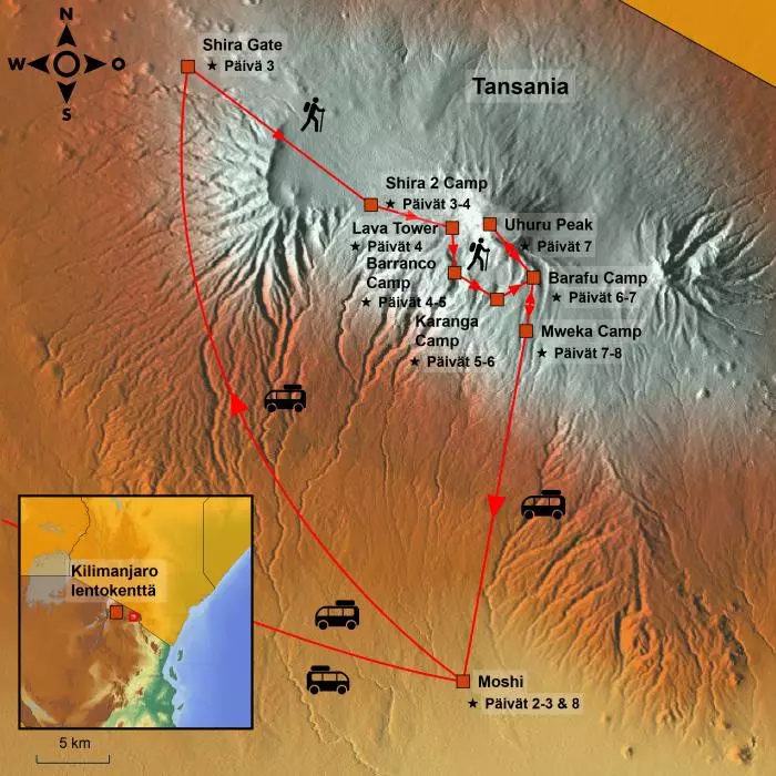 Korkeudet: Moshi: 915 m mpy, Shira Gate: 3 600 m mpy, Shira 2 Camp: 3 840 m mpy