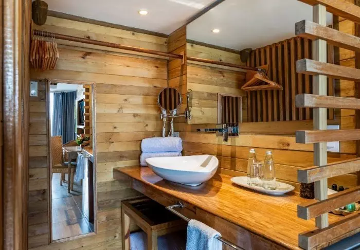 Hotellissa on vain 42 huonetta, joten tiedossa on viihtyisä ja intiimi loma. Kaikki huoneet on rakennettu puusta ja bambusta, ja ne sointuvat kauniisti luontoympäristöönsä. Huoneissa on ilmastointi, WiFi, satelliittitelevisio, minibaari/jääkaappi, tallelokero ja oma kylpyhuone, jossa on ilmaisia kylpytuotteita.