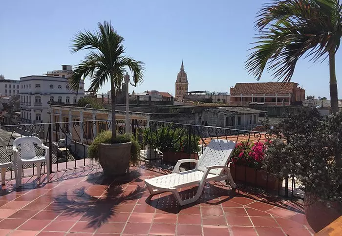Hotellissa on katettu ulkoilmaravintola, josta avautuu upea näköala Cartagenaan.
