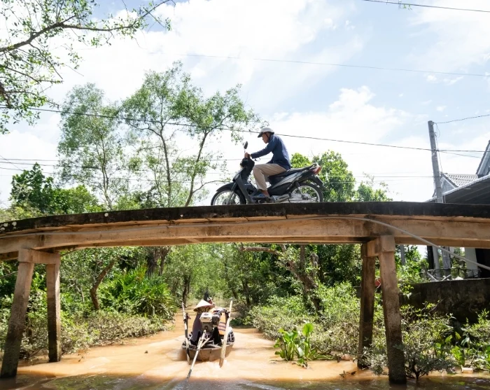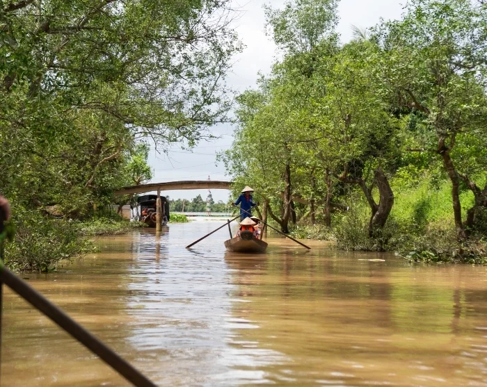 Et joudu matkustamaan pitkälle Ho Chi Minhin kaupungista, kun maisema alkaa jo muuttua. Tien varrella näet vihreitä peltoja sekä ohitat pieniä jokia ja kanavia, jotka kiemurtelevat halki tasaisen maiseman. Voit nähdä paikallisia viljelijöitä töissä pelloilla ja vesipuhveleita laiduntamassa tien reunalla. Tien varrella pienet kojut houkuttelevat tuoreilla hedelmillä.