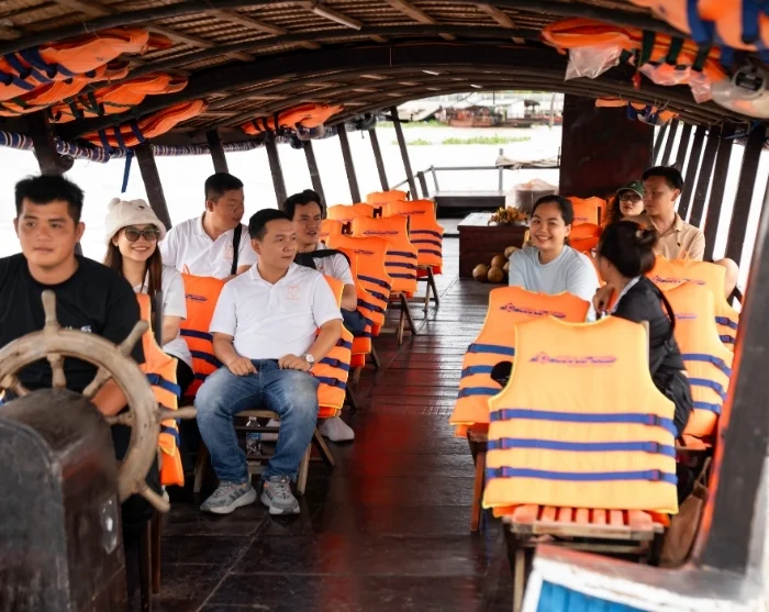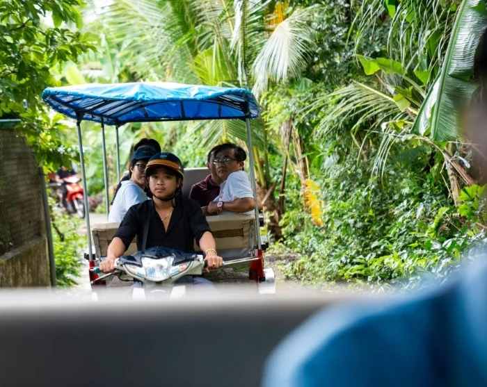 Noin 2,5 tunnin ajomatkan jälkeen saavut Cai Benin kaupunkiin, joka on viehättävä jokikaupunki Mekongin suistossa ja tunnettu rehevistä hedelmätarhoistaan sekä aidosta maaseudun tunnelmastaan. Täällä nouset veneeseen ja lähdetään tutustumaan vehreään suistoalueeseen. Vierailet paikallisissa pajoissa, joissa taitavat käsityöläiset valmistavat tuotteita kookoksesta. Tämän jälkeen matka jatkuu pienellä, käsin soudettavalilla, perinteisellä puuveneellä – sampaneilla– Mekongin suiston kapeiden ja mutkittelevien kanavien läpi.