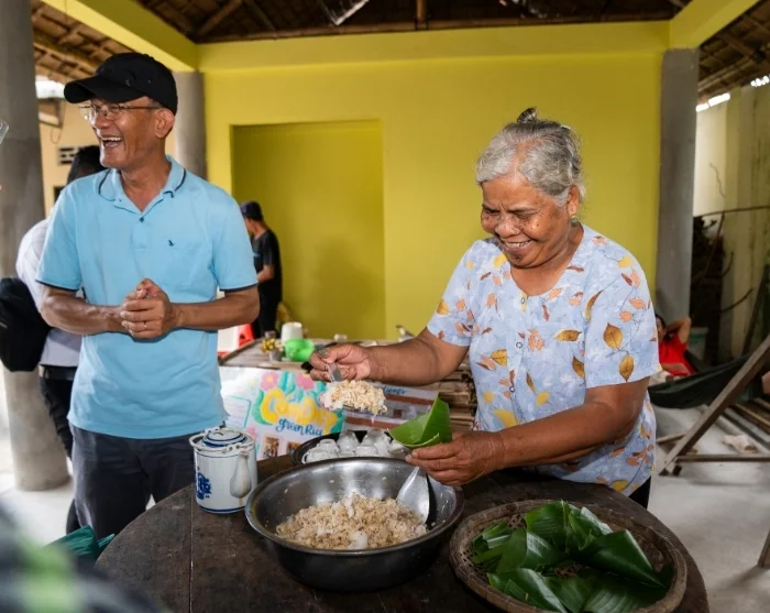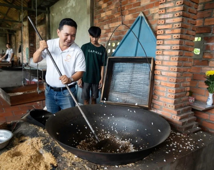 Tuk-tuk kuljettaa sinut kylän rauhallisia teitä pitkin ja ensimmäinen pysähdys on paikallisen perheen luona, missä saat maistaa com depiä (vihreitä riisihiutaleita) ja näet, miten popriisiä valmistetaan.