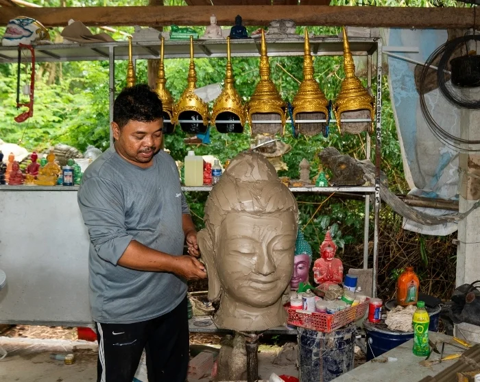 Matka jatkuu vierailulla lahjakkaan khmer-taiteilijan luona, joka valmistaa patsaita ja naamioita alueen pagodeihin.