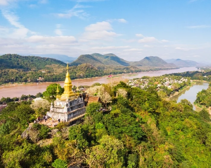 Matka jatkuu Phousi-vuorelle, joka sijaitsee vain kilometrin päässä. Sinua odottaa 328 porrasta vuoren huipulle. Matkalla pääset ihailemaan pieniä temppeleitä ja Buddha-patsaita, joiden äärellä voit levähtää hetken ja nauttia maisemista. Vuoren laelta avautuu upea panoraamanäkymä Luang Prabangin kaupungin, jokien, temppeleiden ja rehevään luonnon ylle – taustalla kohoavat vehreät vuoret kruunaavat maiseman.