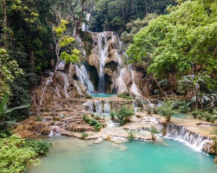 Maukkaan lounaan jälkeen matka jatkuu 30 kilometriä etelään Kuang Si -vesiputouksille. Trooppisen sademetsän ympäröimänä vesi virtaa usean tason putouksina jyrkkää rinnettä alas. Korkein pudotus on 60 metriä, ja alimmalla tasolla voit pulahtaa turkoosinsiniseen, rauhalliseen veteen uimaan.
