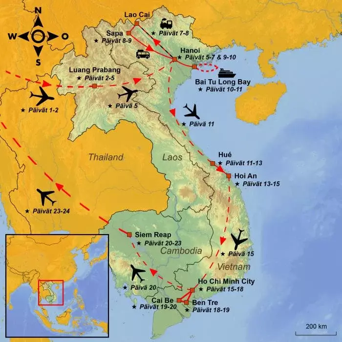Matka alkaa Laosissa, entisessä kuninkaallisessa pääkaupungissa Luang Prabangissa, joka hurmaa rennolla tunnelmallaan ja hyvin säilyneellä siirtomaa-ajan arkkitehtuurillaan. Kaupunki on jo itsessään yksi matkan kohokohdista: voit seurata, kuinka oranssiasuiset munkit keräävät aamualmuksia, ihailla maisemia Phousi-vuorelta, virkistäytyä upeilla Kuang Si -vesiputouksilla sekä seikkailla yömarkkinoiden katukeittiöiden ja käsityöläisten keskellä.