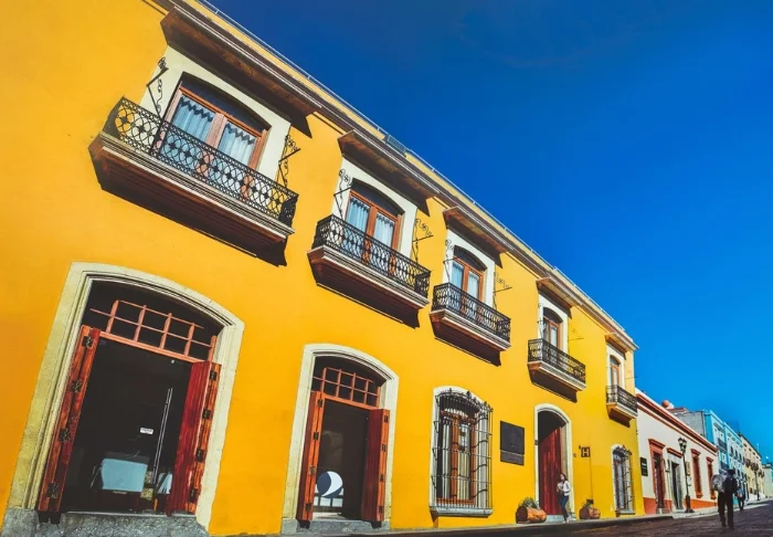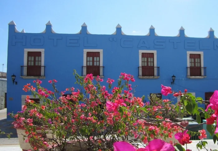 Värikäs hotellirakennus loistaa kauniissa keltaisen, punaisen ja violetin sävyissä, mikä luo paikkaan aitoa meksikolaista tunnelmaa.