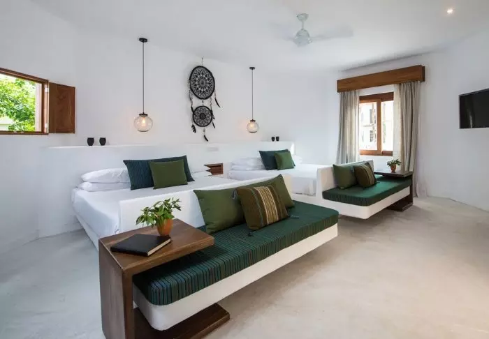 Intiimin retriitin kauniit huoneet ovat kauttaaltaan tyylikkäästi sisustettuja, ja niissä on ilmastointi, kattotuuletin, Wi-Fi ja tallelokero. Huoneita on yhteensä vain yhdeksän, joten jokaisella huoneella on oma viihtyisä terassinsa. Täällä voit nukahtaa kuunnellen aaltojen kuohuntaa. Kun heräät, voit siirtyä riippumattoon nauttimaan auringonnoususta, joka maalaa taivaan kirkkaan abstrakteilla väreillä.