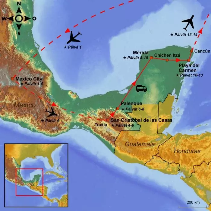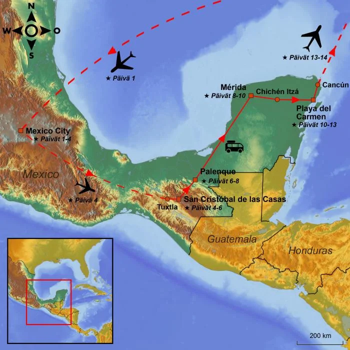 Tänään lähdet Mexico Citystä ja lennät Tuxtlaan joka sijaitsee Chiapasin provinssissa. Sinut noudetaan lentokentältä ja matka jatkuu upeaan Sumideron kanjoniin. Edessäsi on kiehtova kahden tunnin pikaveneajelu, joka vie sinut syvälle kanjoniin, jossa jyrkät vuorenseinät kohoavat ympärilläsi. Saatat nähdä apinoita, krokotiileja ja monia eri lintulajeja. Tämän jälkeen jatkat matkaa bussilla San Cristóbal de las Casasiin, jossa voit tutkia kaupunkia omassa tahdissasi loppupäivän ajan.