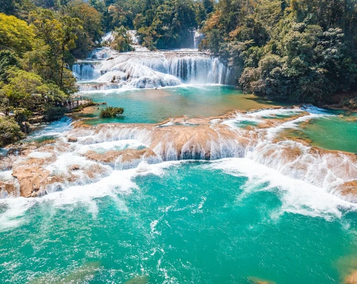 Ensimmäinen pysähdys on Agua Azulin (siniset vesiputoukset) vesiputouksilla, jossa turkoosi vesi virtaa valkeiden kalkkikivitasanteiden yli usealla tasolla. Tämä veden kirkas väri johtuu mineraali- ja kalkkikivipitoisuudesta, joka heijastaa auringonvaloa, luoden lähes taianomaisen ympäristön. Vesiputouksia ympäröi sademetsä, jossa joen kulku on muodostanut pieniä luonnonaltaita, joissa voit kylpeä ja nauttia viileästä vedestä.