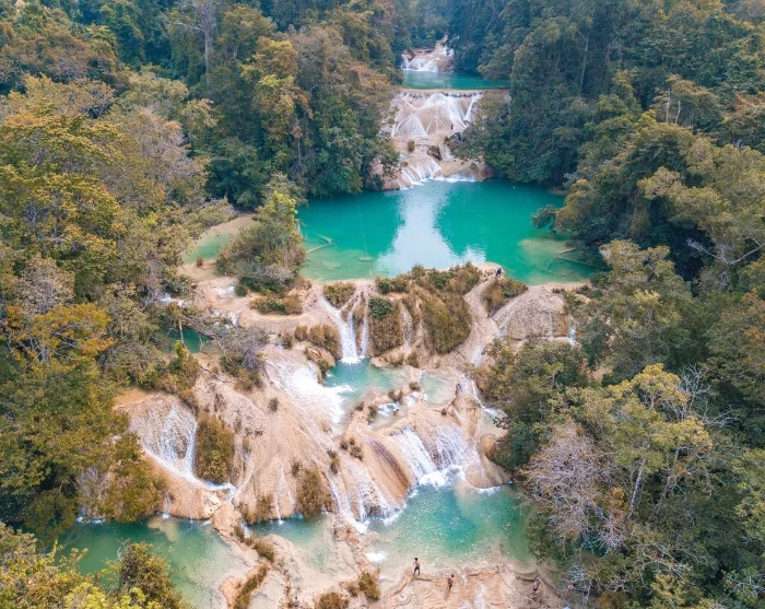Ensimmäinen pysähdys on Agua Azulin vesiputouksilla (siniset vesiputoukset), jossa turkoosi vesi virtaa valkeiden kalkkikivitasanteiden yli usealla tasolla. Veden kirkas väri johtuu mineraali- ja kalkkikivipitoisuudesta, joka heijastaa auringonvaloa, luoden lähes taianomaisen ympäristön. Vesiputouksia ympäröi sademetsä, jossa joen kulku on muodostanut pieniä luonnonaltaita, joissa voit uida ja nauttia viileästä vedestä.