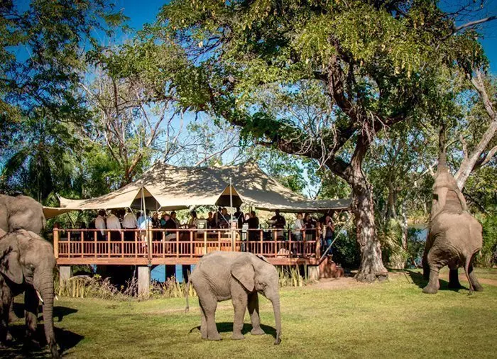 Norsuaitauksen viereen aivan Sambesi-joen päällä olevalle laiturille rakennetussa kahvila-ravintola Elephant Caféssa tarjoillaan lounas (sisältyy hintaan). Ja millainen lounas onkaan tiedossa! Kaikkien ruokien valmistuksessa käytetään paikallisia aineksia, jotka on hankittu lähialueilta: hedelmiä, yrttejä, pähkinöitä, villikukkia jne. – ja luonnollisesti vain kausituotteita. Monet raaka-aineet ovat itse asiassa myös norsujen lempiruokia…ja ravintolan kokit osaavat loihtia niistä toinen toistaan herkullisempia annoksia. Ateria koostuu kolmesta ruokalajista ja palanpainikkeeksi tarjoillaan viiniä – ja kaikki tämä sisältyy hintaan.