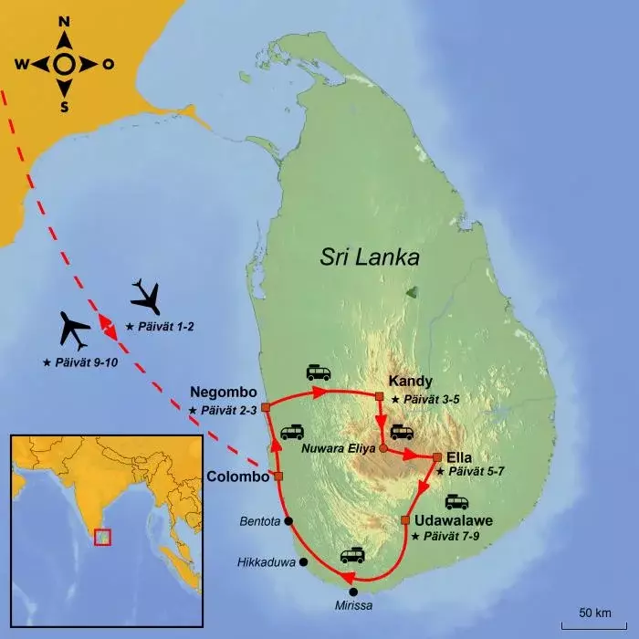 Tänään aloitat matkasi Sri Lankaan. Lähtö on valitsemaltasi lentokentältä, ja lennot sisältävät välilaskun tai -laskuja matkan varrella.