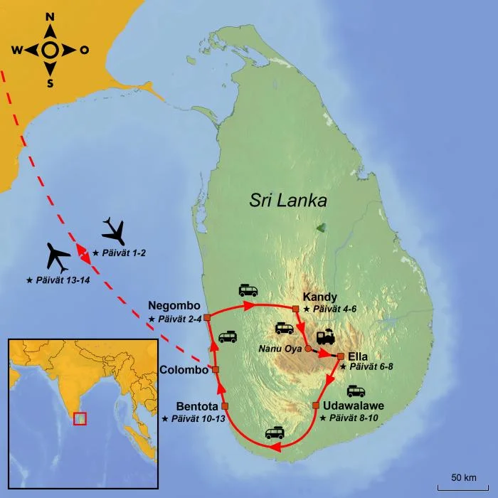 Perheenne seikkailu alkaa Negombon hienohiekkaisilta rannoilta, missä on hyvin aikaa sopeutua trooppiseen tunnelmaan. Täältä matka jatkuu kohti Kandya, ja matkalla pysähdytte paikallisen savenvalajan luona Kegallessa. Siellä pääsette itse kokeilemaan savenvalantaa ja luomaan omat pienet mestariteoksenne muistoksi matkasta. Kandyyn saavuttuanne pääsette nauttimaan perinteisestä srilankalaisesta tanssiesityksestä – värikkäät puvut, rytmikkäät liikkeet ja tuli lumoavat katsojat niin lapsista aikuisiin.