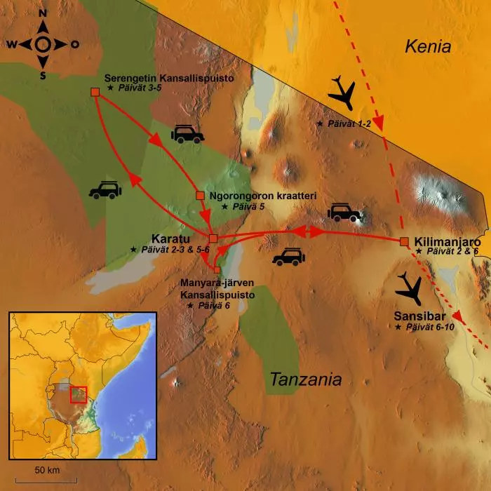 Ensimmäisenä päivänä on edessä lento valitulta lentokentältä Tansaniaan. Matkan varrella on välilaskuja.