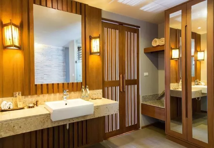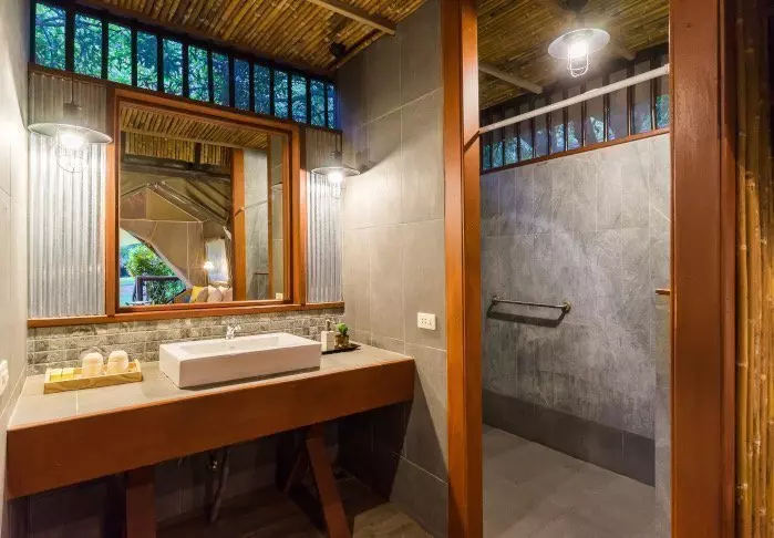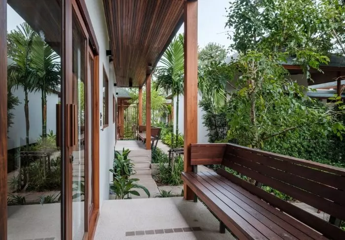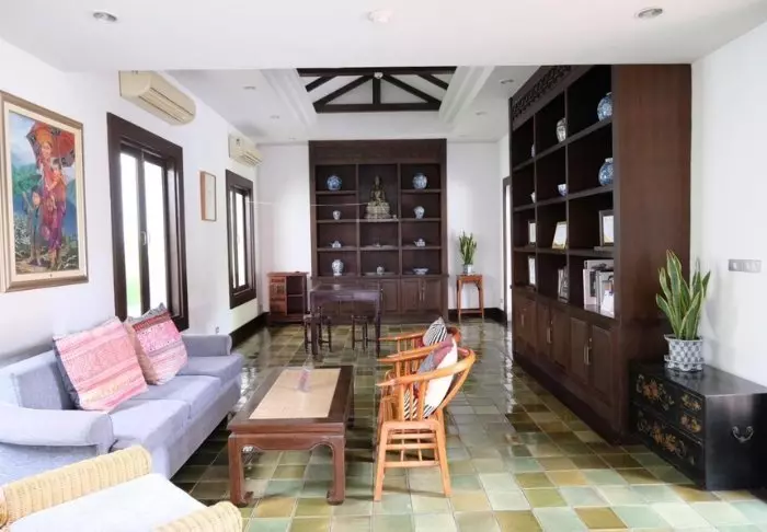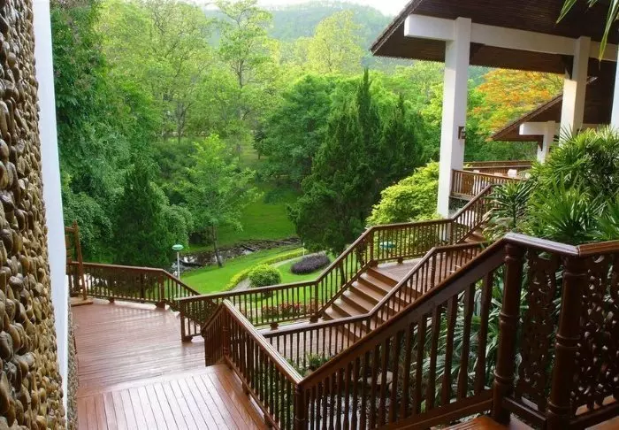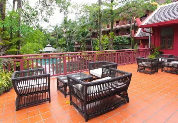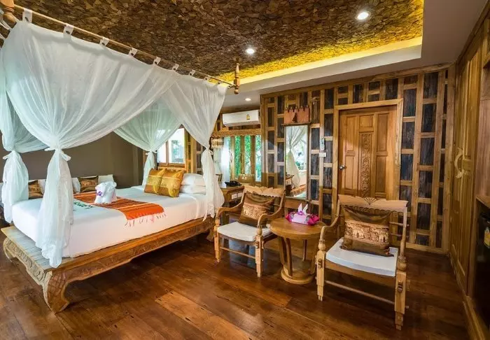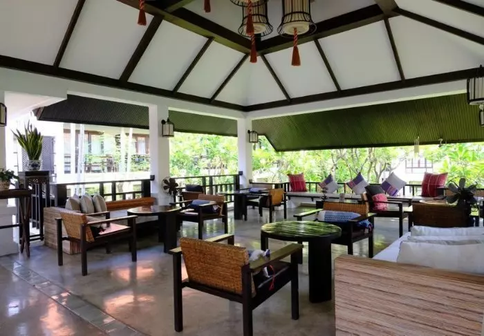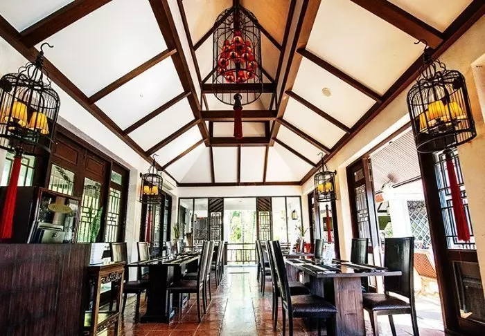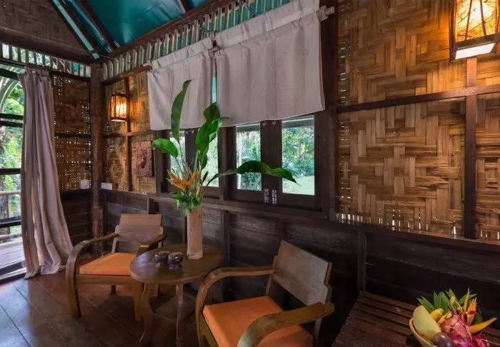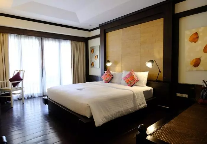 Lomakeskus on rakennettu kauniista tummasta puusta, jota on käytetty myös sisustuksessa, ja se huokuu pohjoisthaimaalaista charmia.
